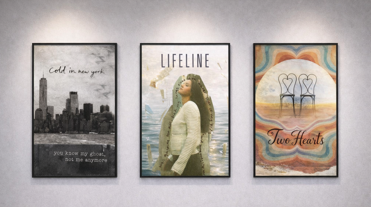 I reimagined my sister’s latest album as a book, each song per spread, and designed posters for the strongest moments.